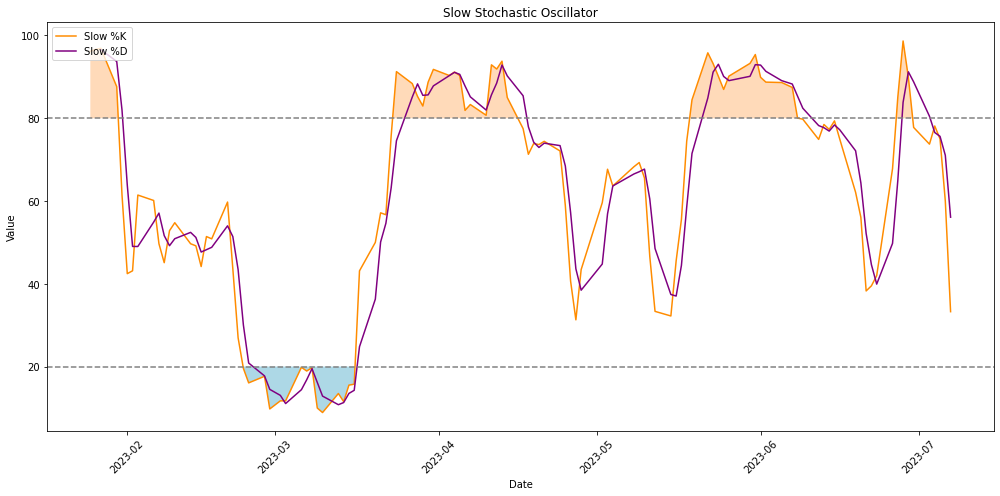 ax.fill_between(df['date'], df['Slow_%K'], 80, where=(df['Slow_%K'] >= 80), facecolor='peachpuff', interpolate=True)