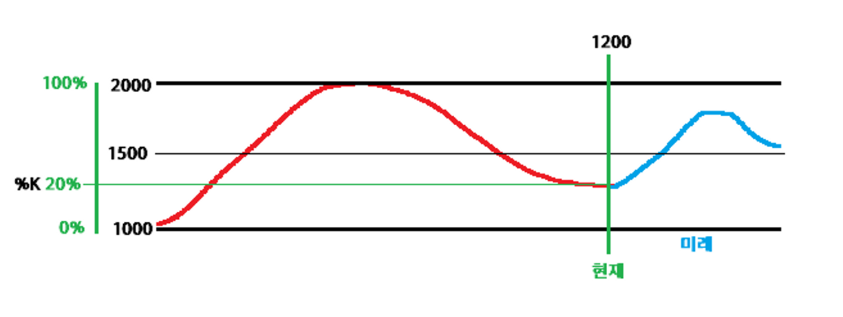 일정 기간 동안 최고가와 최저가 사이에서 현재의 주가 위치를 백분율로 표시해주며, 최고가에 주가가 가까워지면 지표 값은 100에 가까워지고 최저가에 가까워지면 지표 값은 0에 가까워진다.