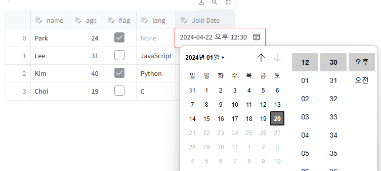 st.column_config.DatetimeColumn은 날짜 및 시간 열을 구성하는 데 사용된다.