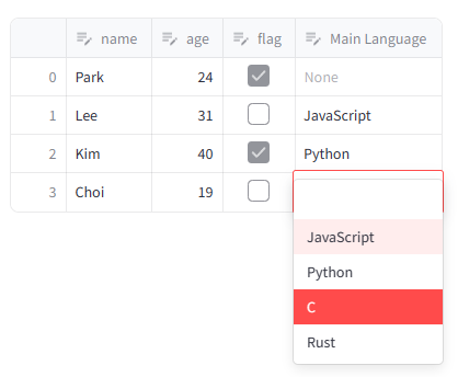 st.column_config.SelectboxColumn은 선택 상자 열을 구성하는 데 사용된다.