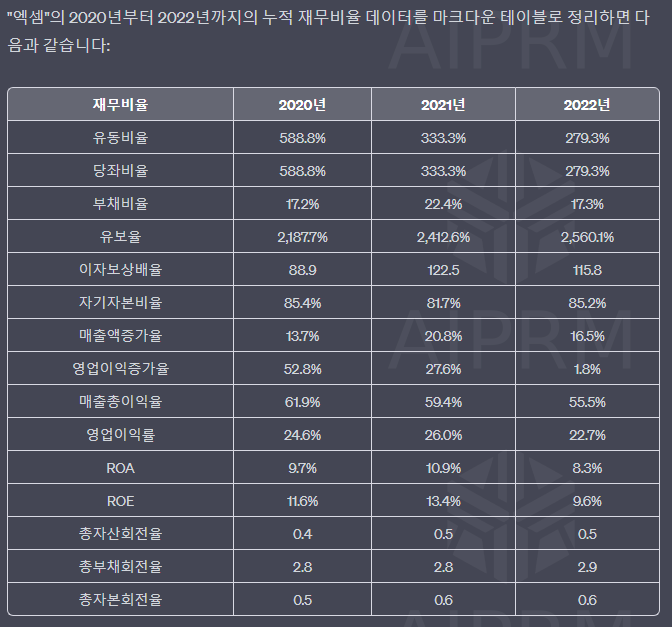 "엑셈"의 2020년부터 2022년까지의 누적 재무비율 분석 결과는 다음과 같습니다.