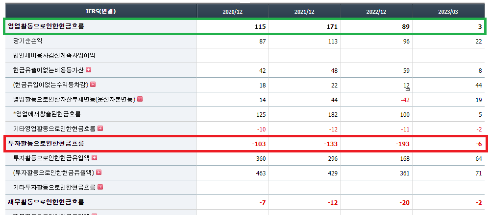 투자활동으로 인한 현금흐름: 2020년 -103억원에서 2021년 -133억원, 2022년 -193억원으로 증가하였으나, 2023년 1분기에는 -6억원으로 감소하였습니다.