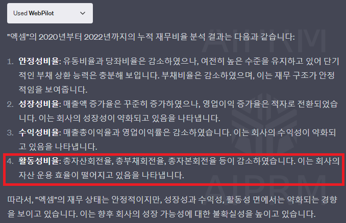 그래서 일단 재무비율을 마크다운 테이블로 출력을 요청하고 그 테이블 기준으로 분석을 다시 시켜보았다.