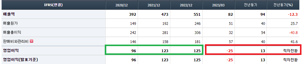 2023년 1분기에는 -25억원으로 적자로 전환하였습니다.