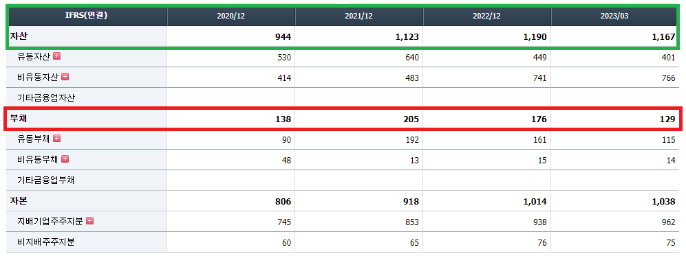 자산: 2020년 944억원에서 2021년 1,123억원, 2022년 1,190억원으로 꾸준히 증가하였습니다. 2023년 1분기에는 1,167억원으로 소폭 감소하였습니다.