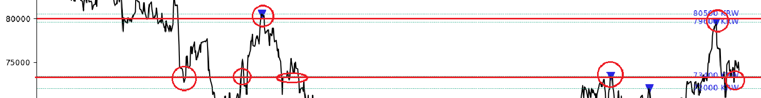 현재 삼성전자는 종가 기준 79,600원에서 가격이 다시 하락했는데(이 때 고가는 79,800원), 해당 구간은 과거에도 가격이 하락했던 구간인 것을 확인할 수 있다.