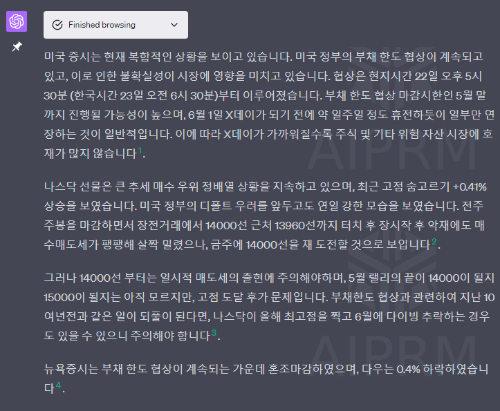 저 답변의 경우 ChatGPT가 한글로 검색을 시도하고 무려 이 포스트를 작성하기 6시간 전에 작성된 내용을 검색해서 요약을 해주었다.