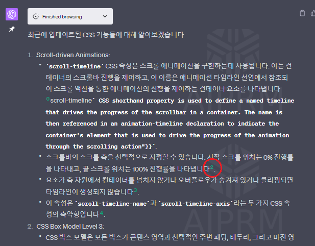 그리고 ChatGPT의 답변 중에 초록색의 숫자가 있는데, 해당 숫자를 클릭하면 답변을 생성할 때 내용을 참고한 링크로 이동이 가능하다.