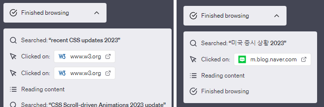 그리고 ChatGPT 답변 상단에 버튼? 토글? Finished browsing을 클릭하면 어떻게 검색을 했는지 보여준다.