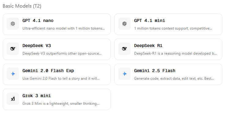 Flowith에서 무료로 사용시 기본적으로 제공하는 모델은 GPT 4.1 nano, GPT 4.1 mini, DeepSeek V3, Gemini 2.5 Flash 등이 있다.