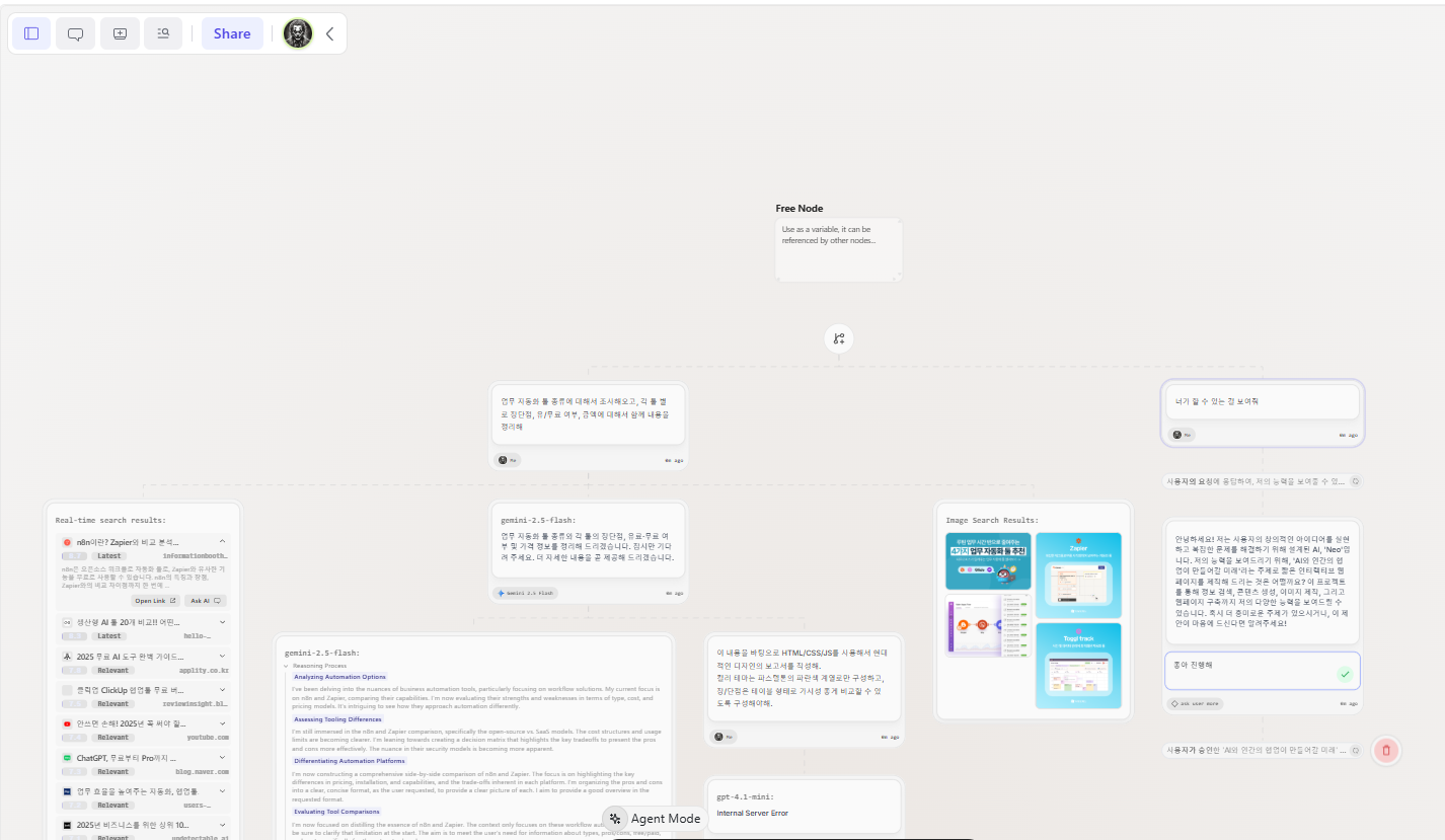 ✔ 캔버스 기반의 다중 AI 인터랙션과 자동화된 에이전트 시스템