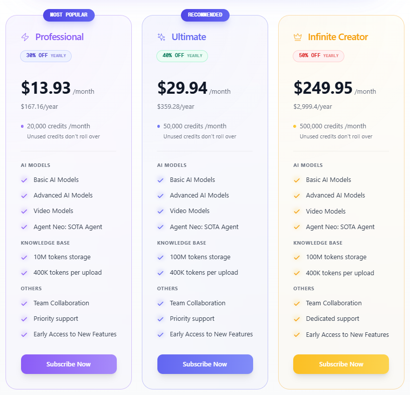 일반적인 개인 사용자 플랜에서는 일정량의 AI 호출량, 제한된 모델 선택, Knowledge Garden 용량 제한 등이 있을 수 있으며, 팀 플랜으로 올라가면 모델 선택의 폭이 넓어지고 동시 협업 기능, API 연동, 더 많은 저장 용량 및 고속 응답 등을 활용할 수 있다. 특히 Oracle 모드의 무제한 사용, 외부 플러그인 통합, 캔버스 히스토리 관리 등의 고급 기능은 상위 요금제에서 제공된다.