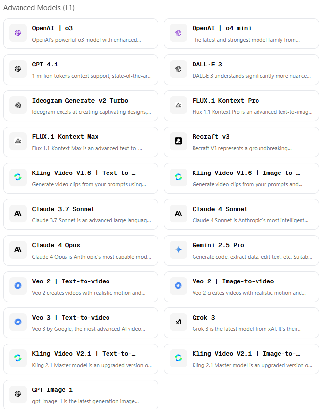 - 다양한 모델과 멀티모달 연동 : GPT-4o, Claude 3.5/3.7, Gemini, DALL·E 등 텍스트·이미지 생성 모델을 한 화면에서 동시에 사용 가능