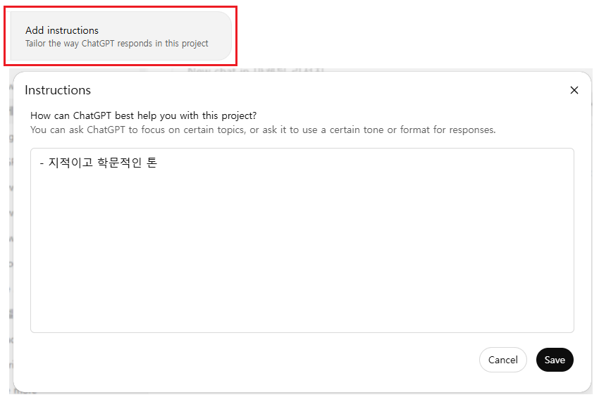 Add instructions 버튼을 클릭하면 이 프로젝트에만 해당하는 별도 커스텀 지침을 추가할 수 있다. 지침을 추가함으로써 일관된 형식을 유지해서 작업을 할 수 있다.