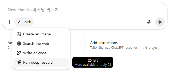 비교적 최근에 업데이트된 기능들인데, 프로젝트에서 이제 보이스 모드와 딥리서치를 사용할 수 있다. 구독 요금제에 따라 딥리서치는 사용량이 제한되겠지만, 프로젝트 내에서 딥리서치를 활용한다면 데스크 리서치에도 크게 도움이 되지 않을까 싶다.
