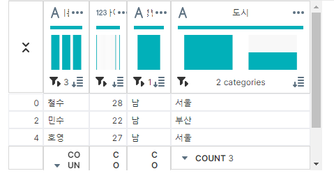 # '도시' 컬럼에서 '서울' 또는 '부산'에 해당하는 데이터만 선택