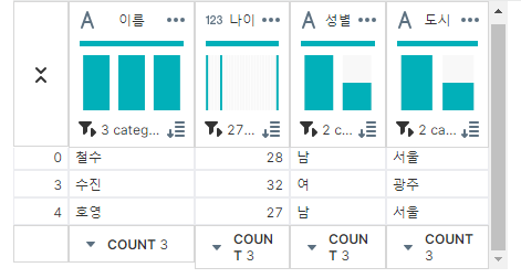 # 예시: 나이가 30세 미만이고 이름에 '수'가 포함된 데이터 선택